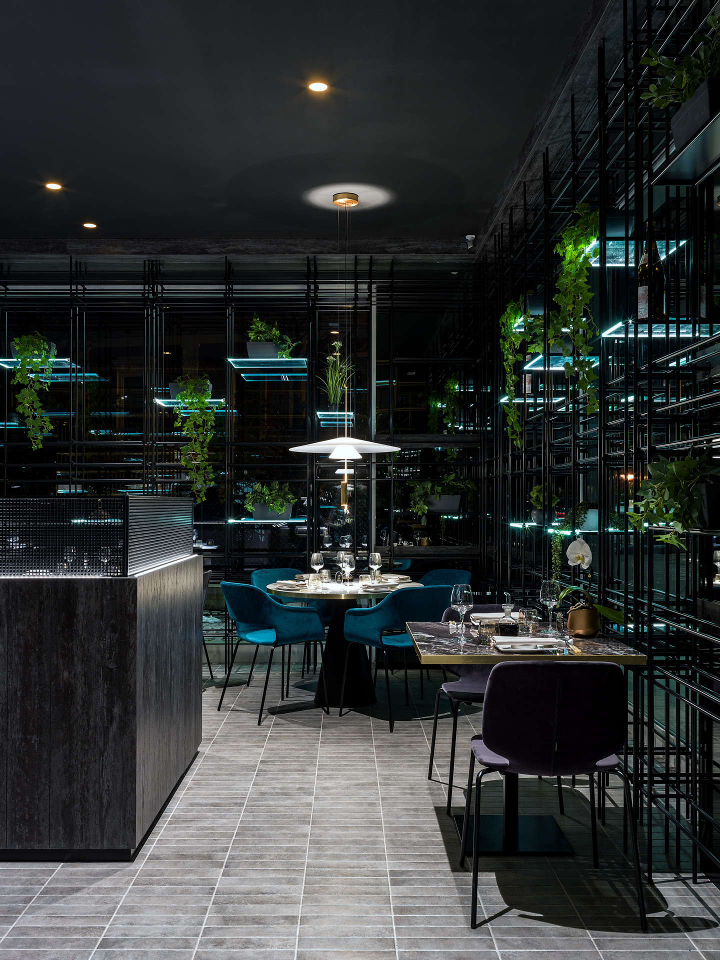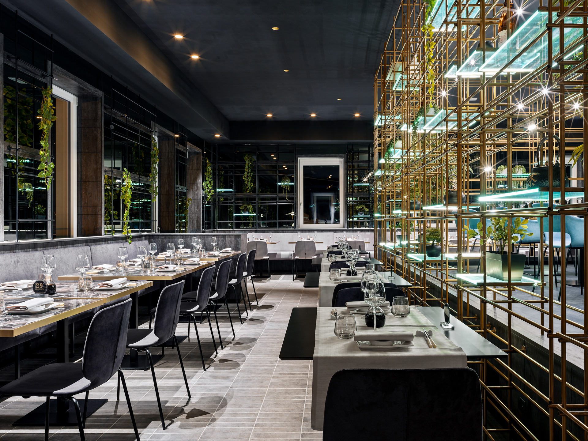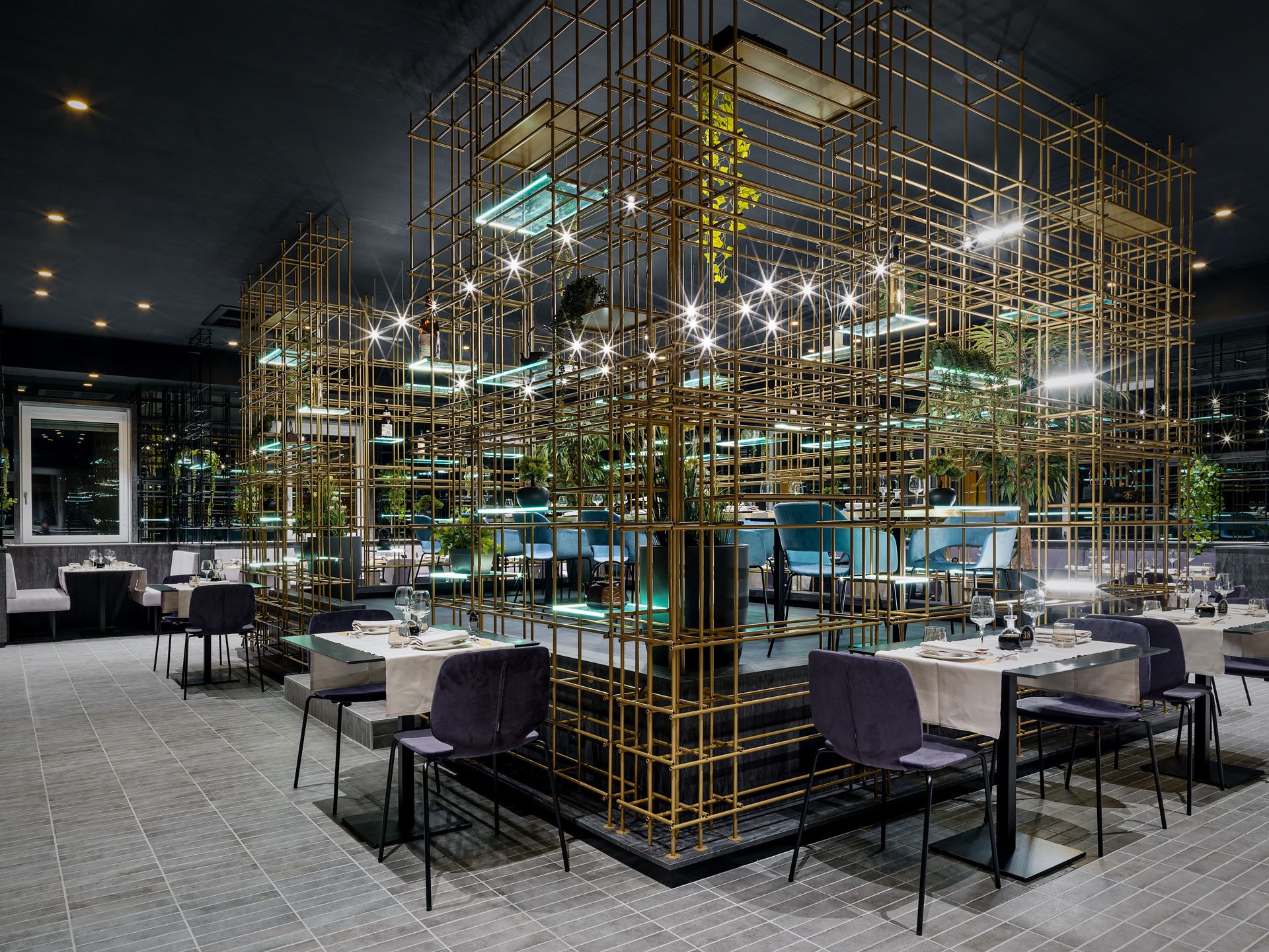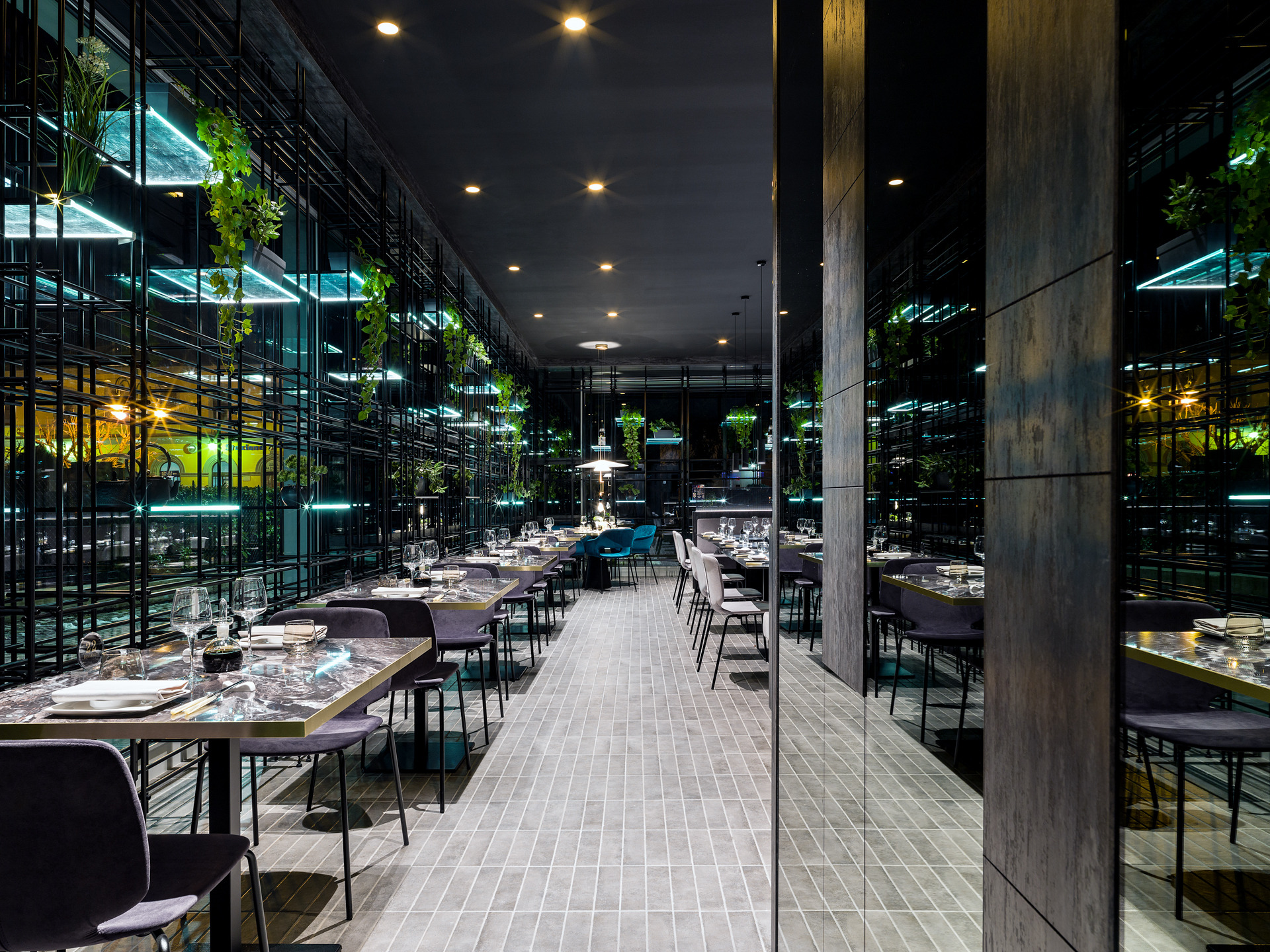 Das Gebäude hat sich viel für dieses Projekt geleistet; Eine gewöhnliche Pflanze, die in einen szenografischen Begrenzungskäfig in Eisenröhren gehüllt haben, zu denen einige leuchtende Regale mit ruhenden, grün hängenden Pflanzen und verschiedenen Objekten im orientalischen Stil hinzugefügt wurden, die alle durch die Spiegelbeschichtungen der Wände verstärkt wurden, die noch mehr Tiefe verleihen und Größe des Restaurants.
