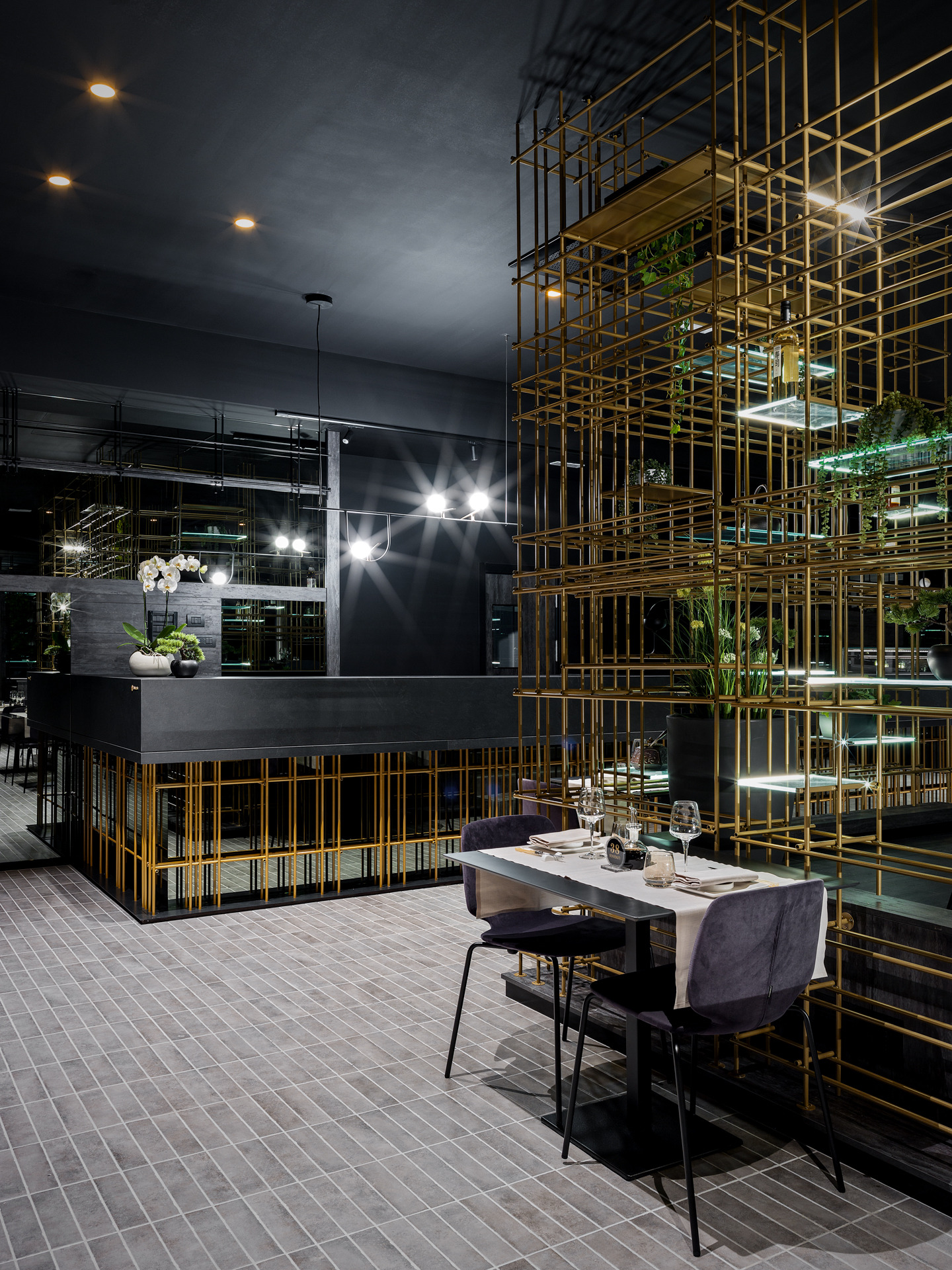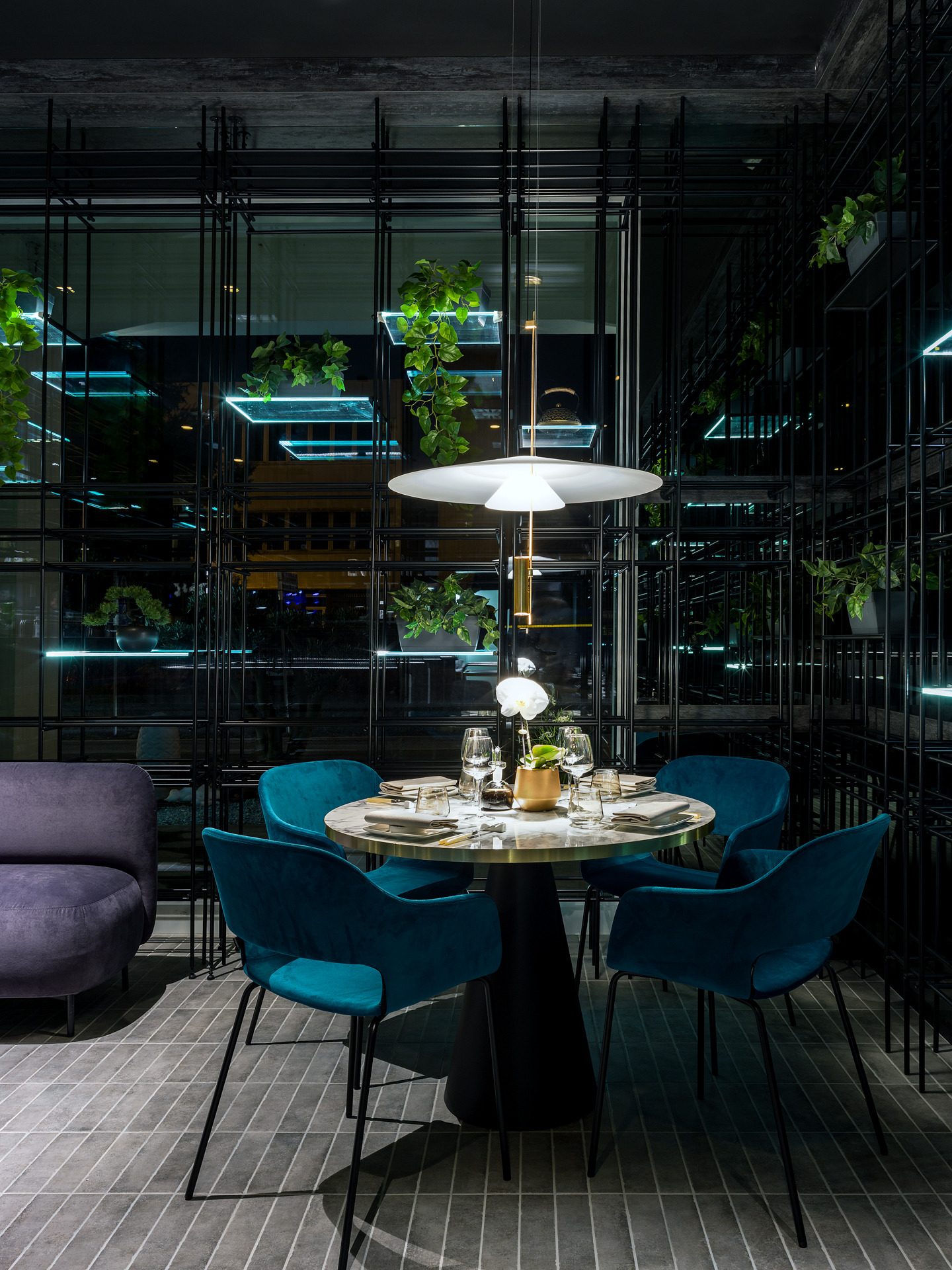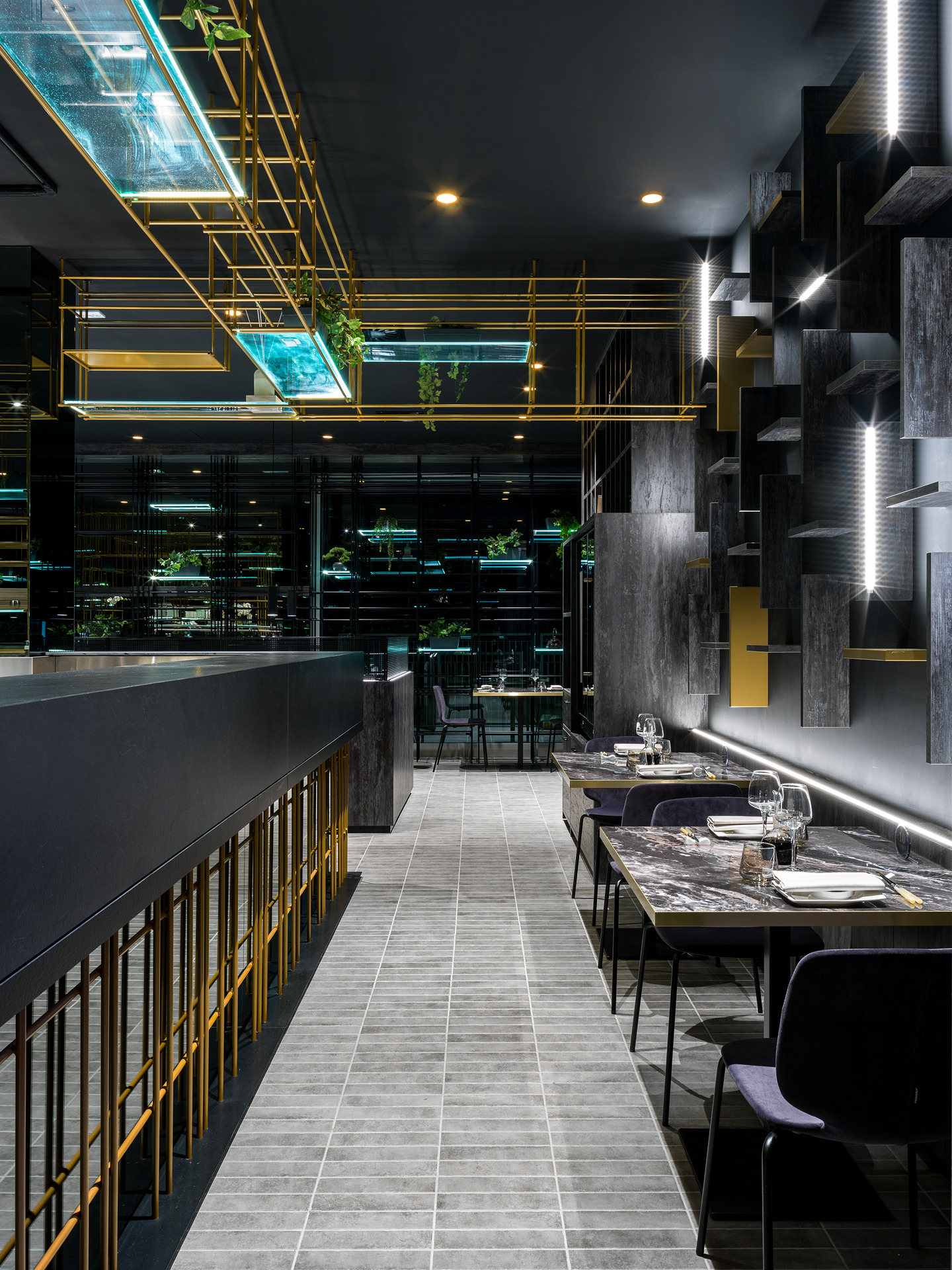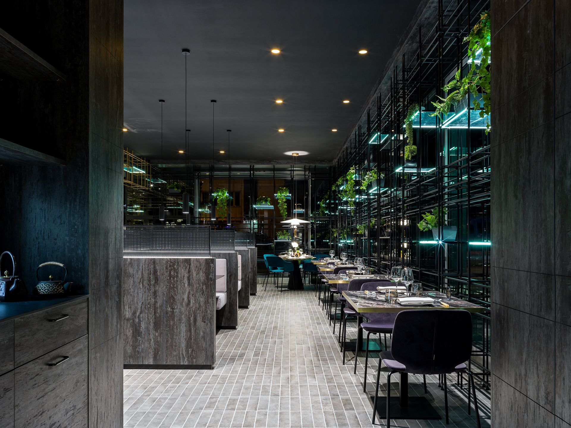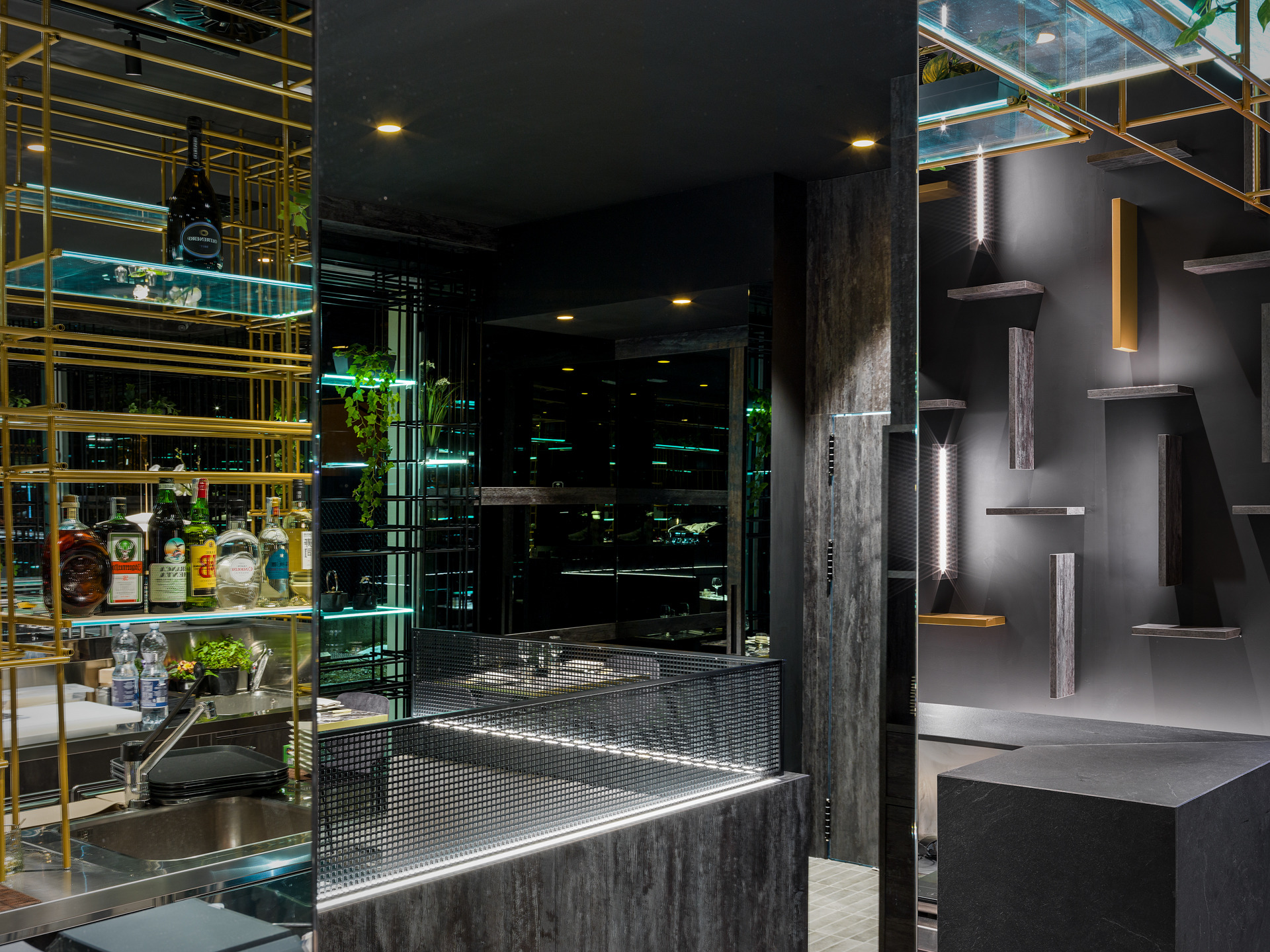 Das Gebäude hat sich viel für dieses Projekt geleistet; Eine gewöhnliche Pflanze, die in einen szenografischen Begrenzungskäfig in Eisenröhren gehüllt haben, zu denen einige leuchtende Regale mit ruhenden, grün hängenden Pflanzen und verschiedenen Objekten im orientalischen Stil hinzugefügt wurden, die alle durch die Spiegelbeschichtungen der Wände verstärkt wurden, die noch mehr Tiefe verleihen und Größe des Restaurants.