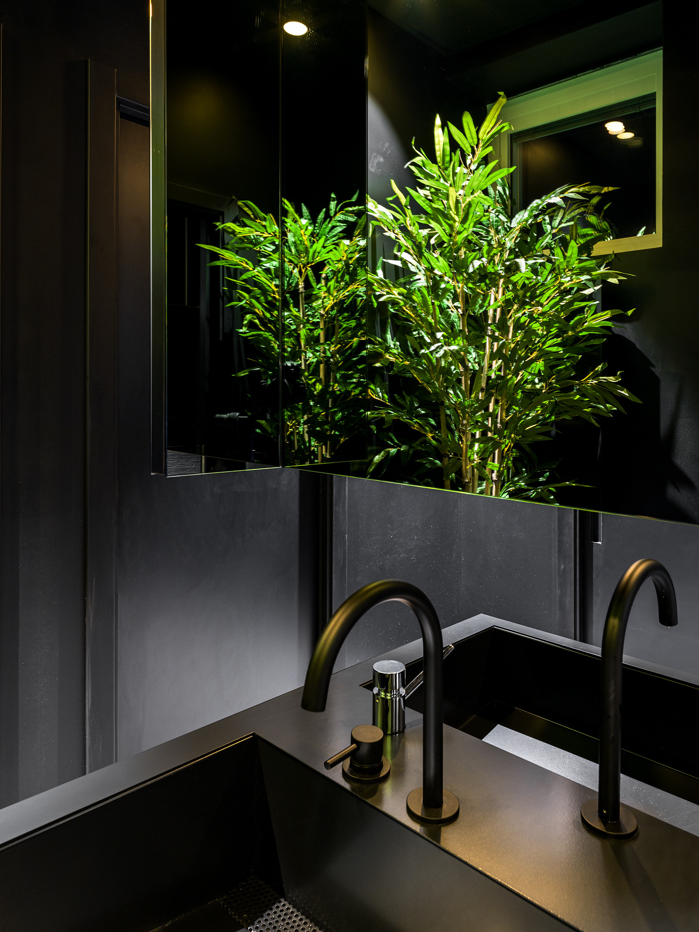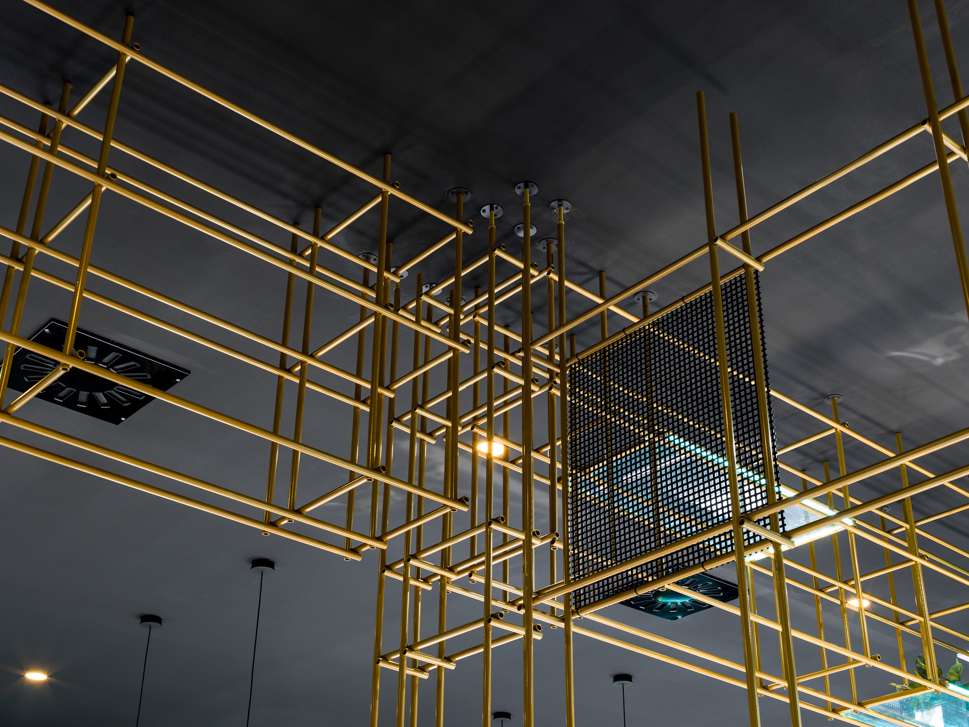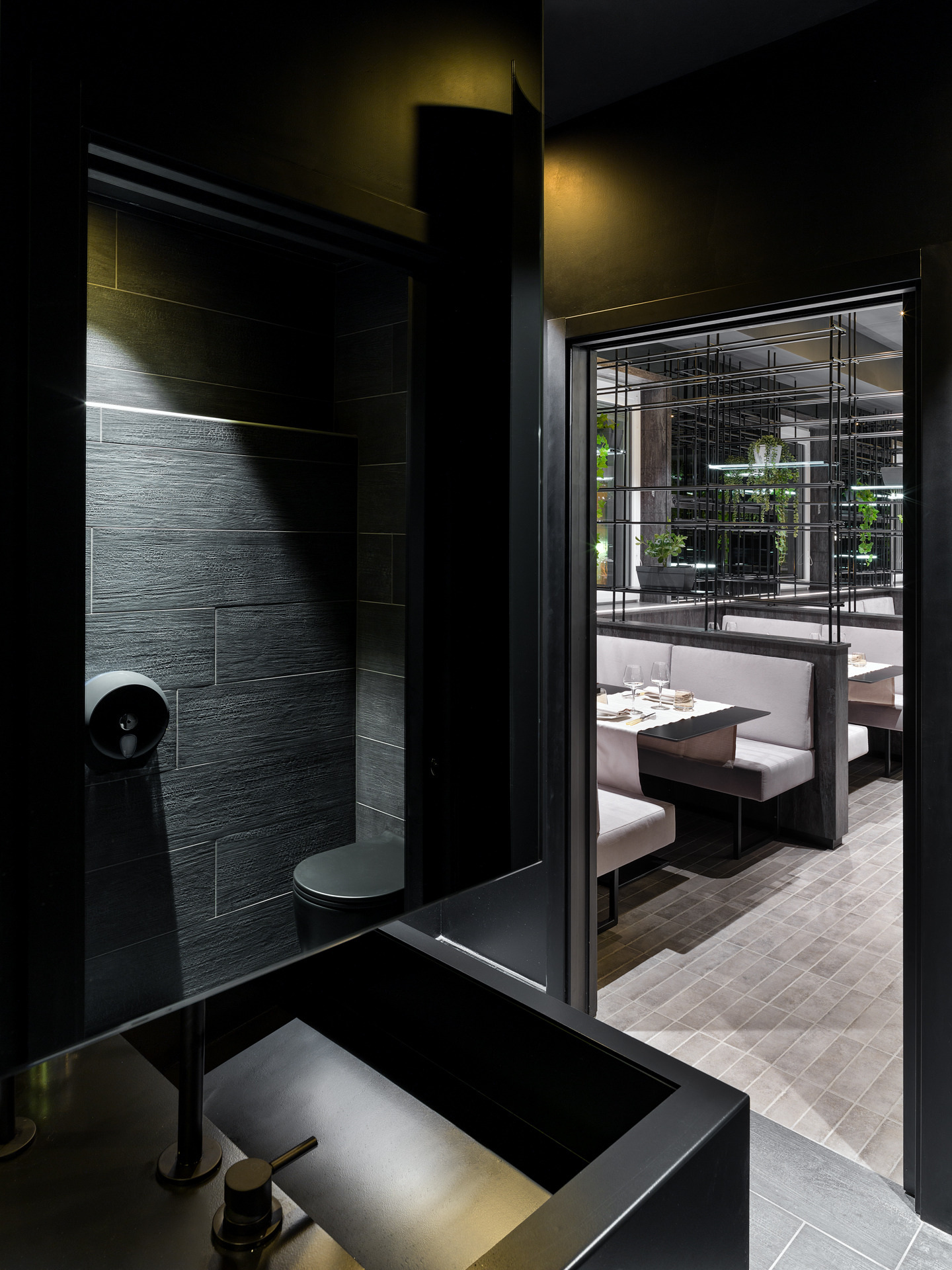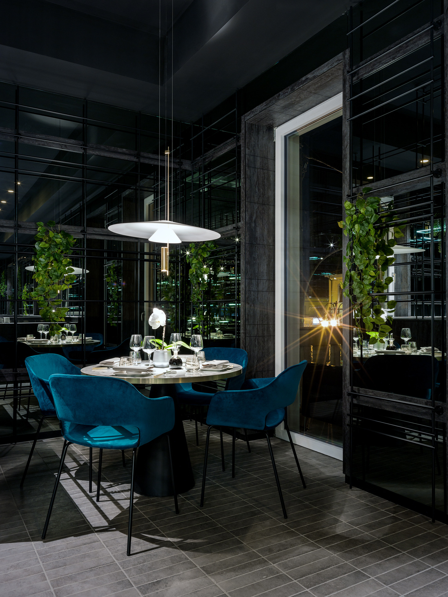 Das Gebäude hat sich viel für dieses Projekt geleistet; Eine gewöhnliche Pflanze, die in einen szenografischen Begrenzungskäfig in Eisenröhren gehüllt haben, zu denen einige leuchtende Regale mit ruhenden, grün hängenden Pflanzen und verschiedenen Objekten im orientalischen Stil hinzugefügt wurden, die alle durch die Spiegelbeschichtungen der Wände verstärkt wurden, die noch mehr Tiefe verleihen und Größe des Restaurants.